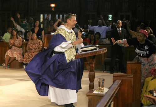 Granted, I coulda seen this removal coming a MILE away, and yes I’m sure Stevie Wonder could have as well, but honestly, the South Side of Chicago had definitely been lulled into a stupor that Fr. Pfleger was an untouchable, because even I believed the hyped. I mean, from a white guy with blue eyes who frequently preaches in Kente cloth, in front of a picture of black Jesus and chain smokes–I mean, he was a black church pastor, the church was his lock, stock and barrel!