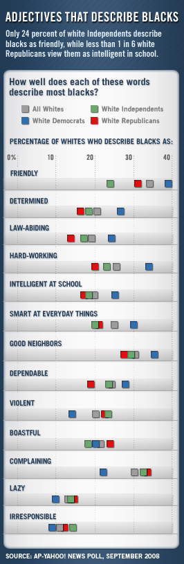 Among white independents, racial stereotyping is not uncommon. For example, while about 20 percent of independent voters called blacks “intelligent” or “smart,” more than one third latched on the adjective “complaining” and 24 percent said blacks were “violent.”
