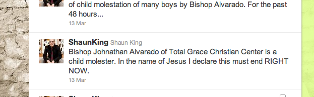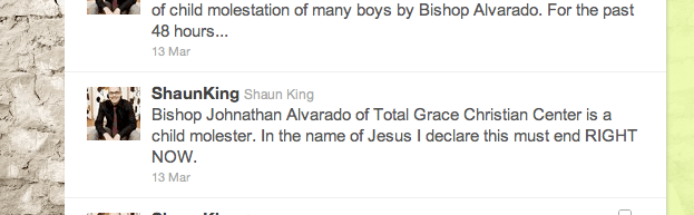 I guess I felt the need to make a comment because, well, the Kings decided to make it public. I went on over to Shaun’s Twitter page and realized that he had went on an impassioned rant about child molestation and the connection between Atlanta being an international hub for child and sex trafficking and mega-churches. (For the record, King never drew any apparent connection. I’m not saying that their isn’t, but even I was hard-pressed to see what it was.) And he went so far as to actually name Bishop Alvarado a child molester.