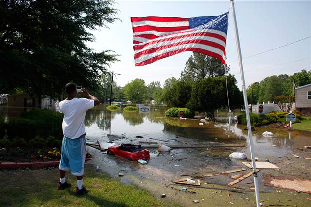 A man takes a picture of a flooded mobile home park as floodwaters slowly rise in Memphis, Tenn., May 8. (Eric Thayer / Reuters)