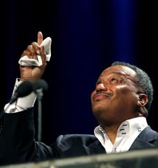 The Rev. Fred Luter, pastor of the Franklin Avenue Baptist Church, greets congregation members during Sunday services in New Orleans. Luter is the new face of the Protestant denomination that formed over a split with its northern counterpart over the issue of slavery before the Civil War. Faced with growing diversity in the United States and declining membership in some of its churches, the denomination is making an effort to distance itself from its troubled racial past.