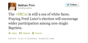 The possibility of Luter being a token has nothing to do with him, but all about what does SBC say in fashioning and creating their own future. For SBC to reiterate in the year 2012 that they have stuck to their 1995 pledge means that they’re trying too hard. One doesn’t need to talk about it, but be about it. If they were serious about it, they wouldn’t have to remind everyone they were serious about it. And while I’m sure Nathan Finn, professor at Southeastern Baptist Theological seminary, meant well by his tweet, if the election of one black president is the salve to decades of racial strife, then yes, Obama’s presidency has effectively ended racism in America.