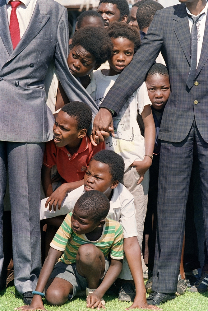 SOWETO, SOUTH AFRICA: Young boys try to see ANC President Nelson Mandela at Orlando soccer stadium 12 February 1990 whilst thousands of Sowetans wait for him. Mandela arrived in Johannesburg this evening but has not been to Soweto yet. (Photo credit should read ALEXANDER JOE/AFP/Getty Images)